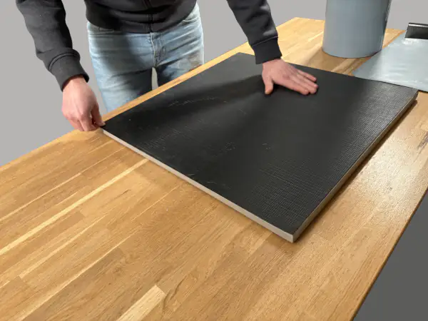 - Reinigung: Säubern Sie die Unterseite der Platte gründlich. Die Fläche muss staubfrei und trocken sein, damit der Kleber optimal haftet.