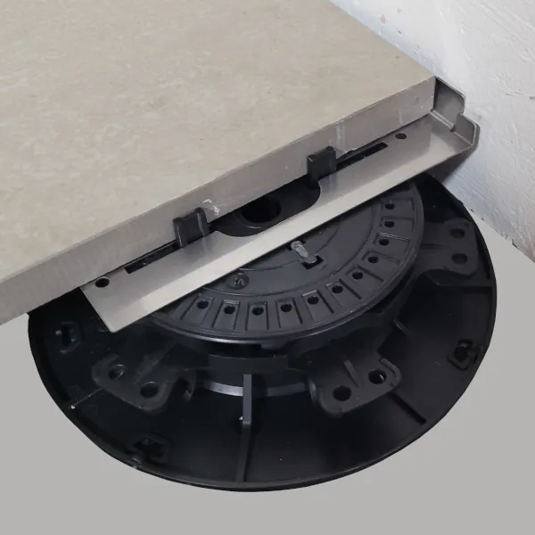 - Stelzlager positionieren: Stellen Sie das Stelzlager direkt an den Randbereich. Falls Sie einen besonders geringen Abstand zur Mauer benötigen, können Sie den Fuß des Stelzlagers vorher einfach zuschneiden.