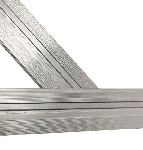 Oftmals erfordern komplexe Terrassengrundrisse, dass zwei Grundprofile in einem schrägen Winkel aufeinanderstoßen. In solchen Situationen reicht das bloße Auflegen der Schienen nicht aus, um eine dauerhafte Stabilität zu gewährleisten. Genau hier setzen Sie den Schrägverbinder ein. Er fungiert als mechanische Brücke, die beide Profile fest miteinander koppelt. Die folgende Abbildung zeigt diese Situation verdeutlicht von oben: